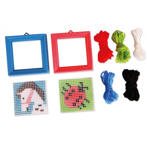 Dezvolta indemanarea si fantezia copiilor, ajuta la formarea capacitatii de concentrare. Continut: 7 snururi de culori diferite avand capetele plasticate (gen siret), 2 cadre plastic perforate avand o imagine pretiparita (buburuza si bust cal),care au rama cu agatatoare de perete. Dimensiune cadru cu rama:10x10 cm ), 1 brosura cu exemple de cusut .Dimensiune cutie: 20x17x5 cm Varsta recomandata :+3 ani