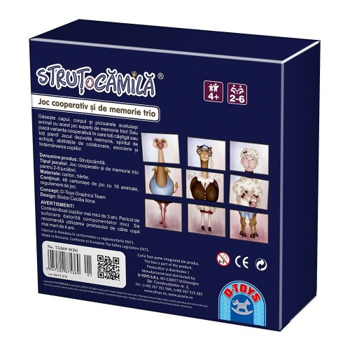Joc de societate si de memorie pentru 2-6 jucatori cu varsta peste 4 ani. Gaseste capul, corpul si picioarele fiecarui animal, potrivindu-le impreuna. Jocul dezvolta memoria, spiritul de observatie, asociere si indemanarea. Cutia-ambalaj are dimensiunile de aproximativ 21X21X4 cm si contine: 48 de cartonase de joc cu 16 animale diferite si regulament de joc.