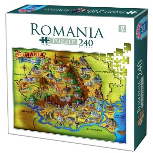 PUZZLE 240 PIESE - HARTA ROMANIEI CU LOCURI TURISTICE CELEBRE. DIMENSIUNE PUZZLE:42X29 CM. DIMENSIUNE CUTIE:30X30X5 CM